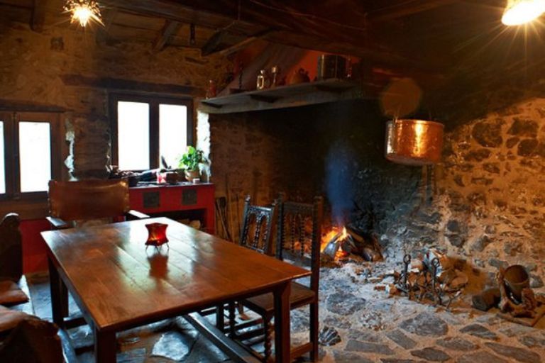 La antigua cocina de la masía conserva el gran fuego a tierra del siglo XVIII, un espacio lleno de historia donde reunirse junto a la chimenea.